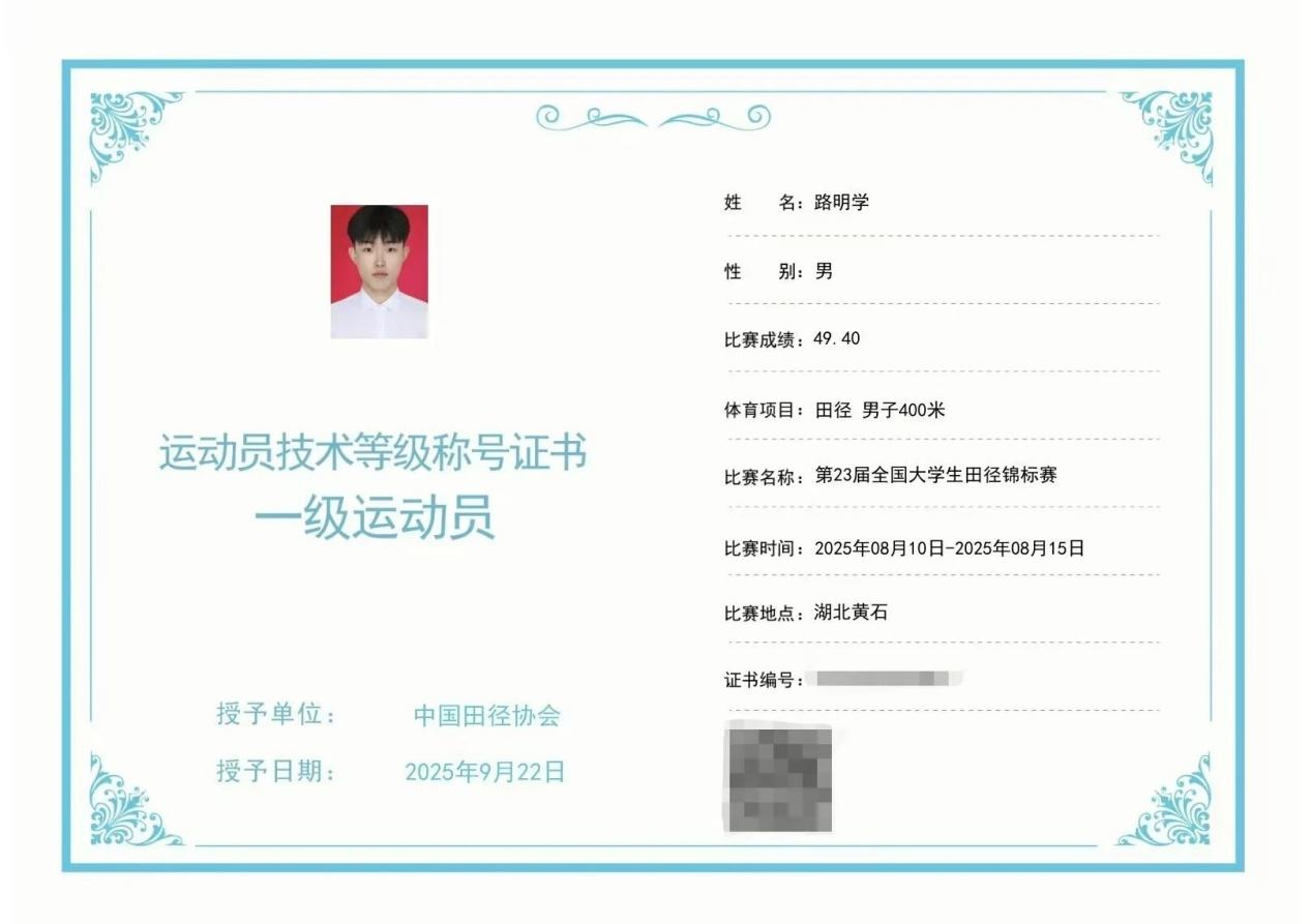 2025年第23届全国大学生田径锦标赛于湖北黄石圆满收官。此次赛事吸引了来自490所高校的5000多名运动员参与,赛场上竞争异常激烈。我校代表队在比赛中表现出色,荣获“全国优秀运动员”“优秀教练员”等荣誉,这让全校师生倍感振奋。 成人导航 路明学同学在男子400m比赛中,以49.40秒的成绩达到国家一级运动员标准。如今,他已正式获得一级运动员证书,成为我校首位获此殊荣的学生。 让我们为路明学同学的出色表现点赞喝彩!...