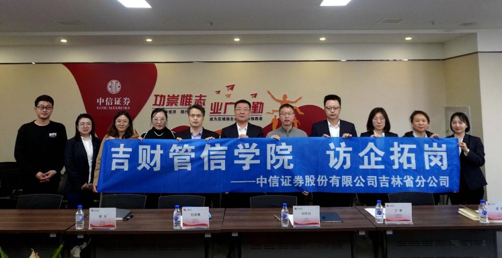 为进一步拓展学生实习就业机会,帮助学生全面地了解金融行业的运作模式,拓宽职业视野,增强实践能力,党委书记丛彪、院长姜建华、党委副书记韩永慧、信息管理系主任相甍甍、团委副书记裴弼赢、数据科学系副主任马心陶等一行6人,前往中信证券吉林省分公司开展“访企拓岗”活动。