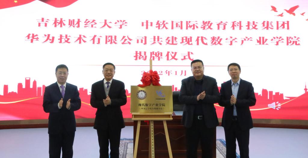 校党委书记孙杰光,校党委副书记、校长童猛,中软国际集团高级副总裁高滨,华为公司吉林省副总经理王建华共同为“现代数字产业学院”揭牌。