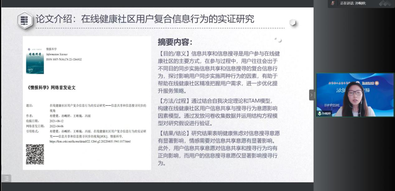 第三项议程,优秀研究生代表、2020级图书情报专业孙畹婷同学做了题为“在线健康社区用户复合信息行为的实证研究——信息共享和信息搜寻同步的视角”的科研论文分享,该论文发表于《情报科学》(CSSCI收录)。