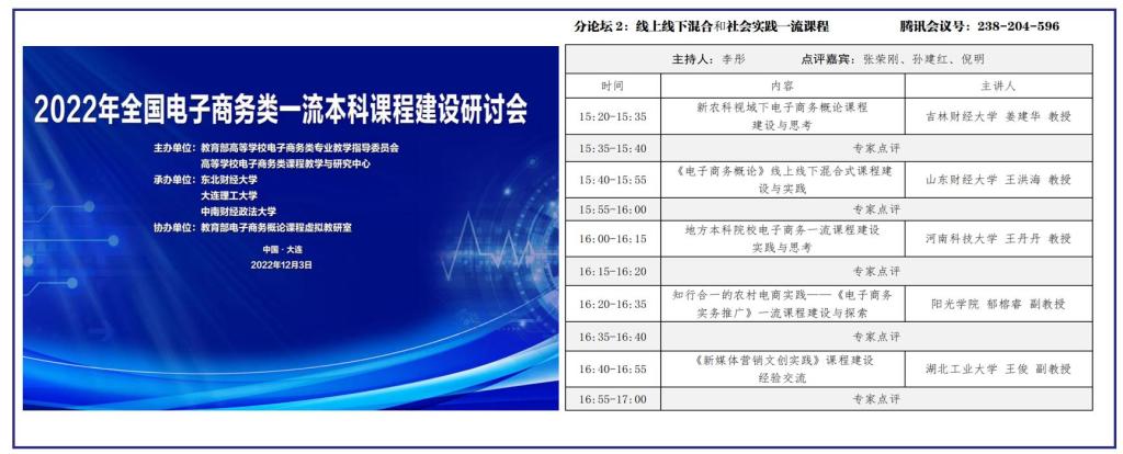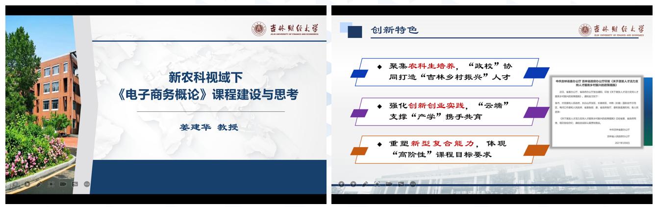 2022年12月3日,“2022年全国电子商务类一流本科课程建设研讨会”以线上方式顺利召开。本次研讨会由教育部高等学校电子商务类专业教学指导委员会和高等学校电子商务类课程教学与研究中心联合主办。我校成人导航 院长姜建华教授代表我校参会,以“新农科视域下《电子商务概论》课程建设与思考”为题,介绍了《电子商务概论》省级一流课程的基本情况,课程体系改革与创新、课程建设团队、课程建设成效等方面。尤其是针对吉林省聚焦基层农业农村电商专业人才匮乏问题,在电子商务专业“订单式农科生”人才培养方面做了详细介绍。