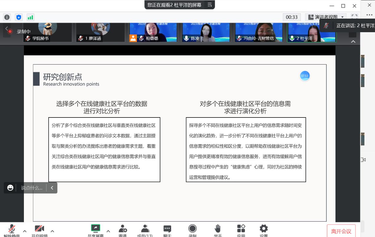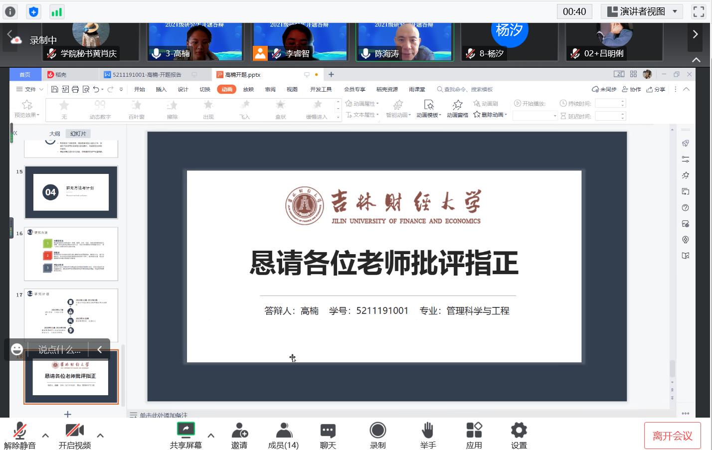 会上,每位研究生从选题背景、国内外研究现状、研究内容、创新点、预期成果等诸多方面进行了详细阐述。评委们听取汇报后,逐一进行点评和指导,并就如何进一步完善学位论文方面提出指导性意见和建议。研究生们虚心听取了每一位评委提出的指导和建议。
