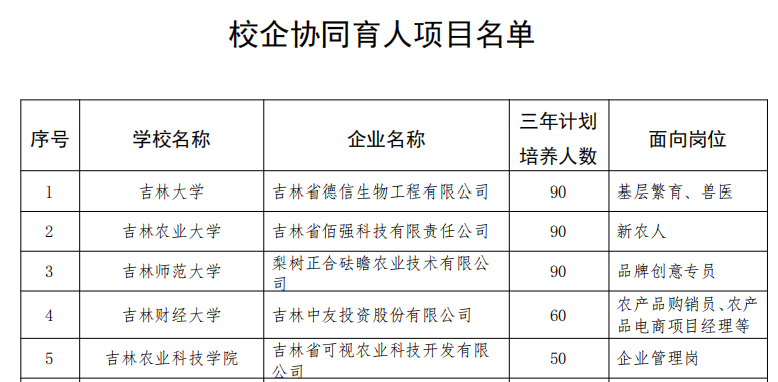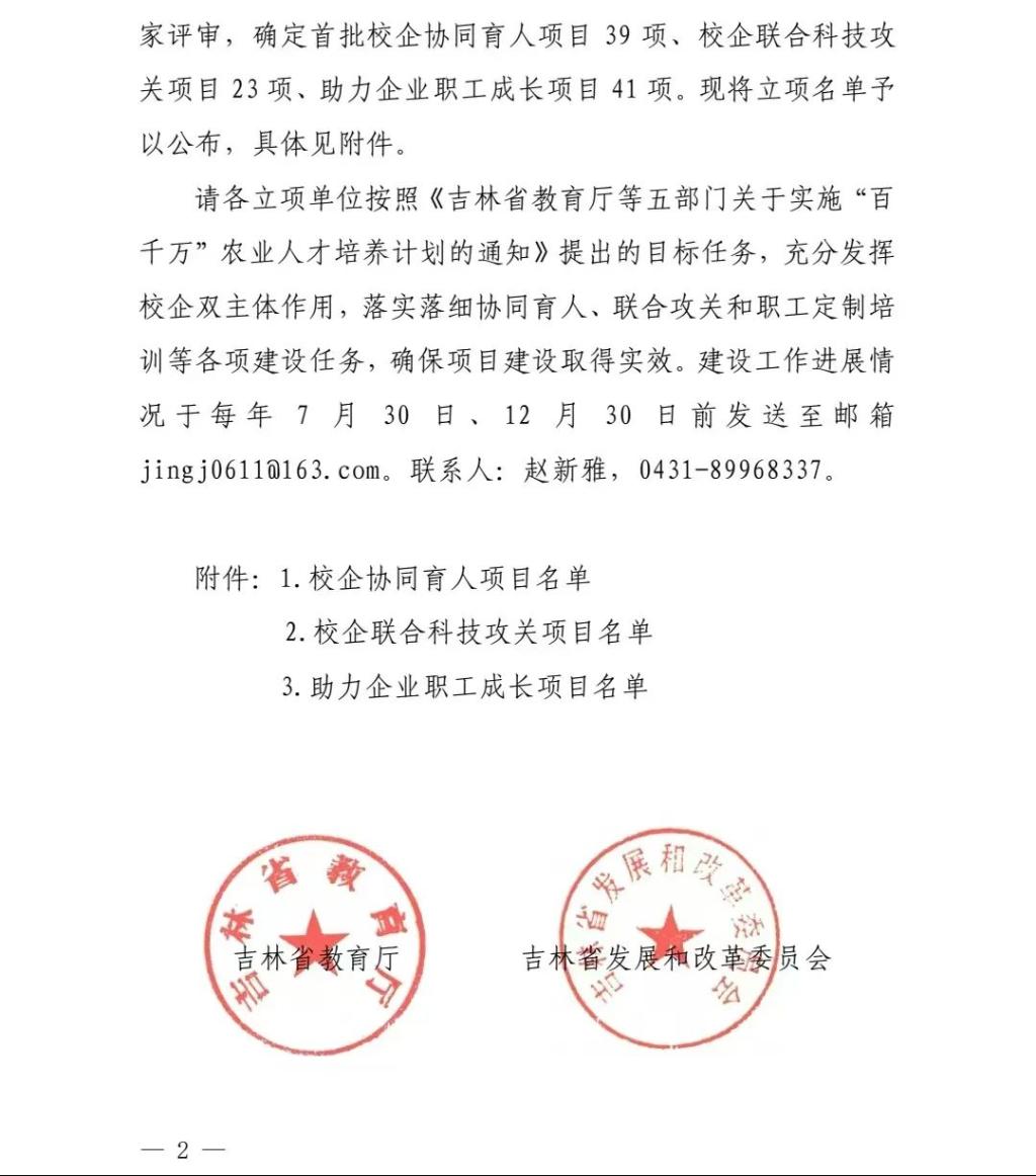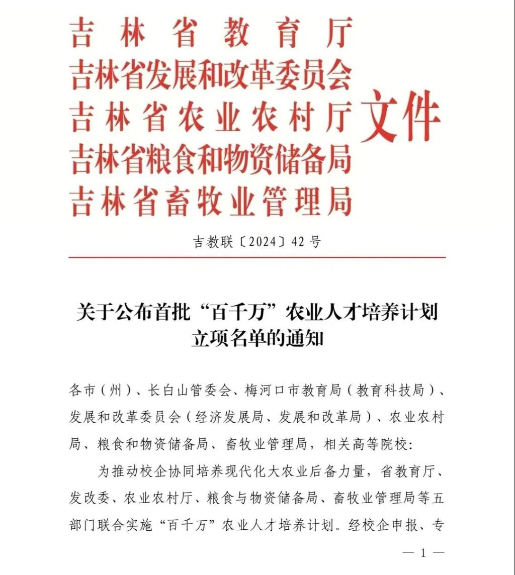 近日,吉林省教育厅、吉林省发展和改革委员会、吉林省农业农村厅等五部门联合公布《关于公布首批“百千万”农业人才培养计划立项名单的通知》(吉教联〔2024〕42号),经吉林省教育厅组织、校企申报、专家评审,我校成功获批校企协同育人项目。该项目由成人导航 电子商务系主任邱春艳负责牵头,与吉林中友投资股份有限公司联合申报。