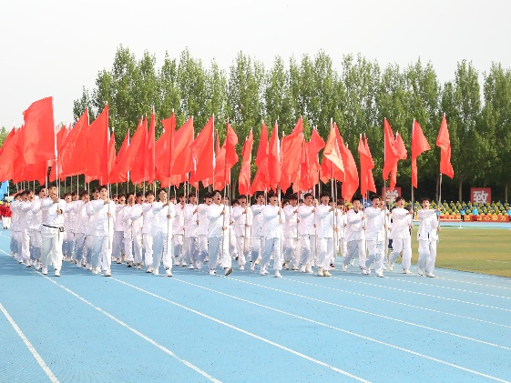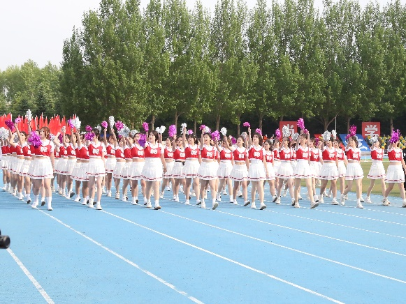 同学组成的花束队、刀旗队,迈着矫健的步伐,气宇轩昂地依次走过主席台前接受检阅。红旗猎猎,刀旗队成员身姿挺拔,步伐铿锵,擎旗列阵阔步前行;花影摇曳,花束队少女手捧缤纷花球,昂首挺胸,以整齐划一的节奏迈向未来。阳光下,翻动的红旗似赤色浪潮,绽放的花束如绚丽云霞,青春的笑颜与跃动的花海相映成趣。她们以坚定步伐诠释蓬勃朝气,用昂扬姿态展现“百舸争流正当时”的豪情。