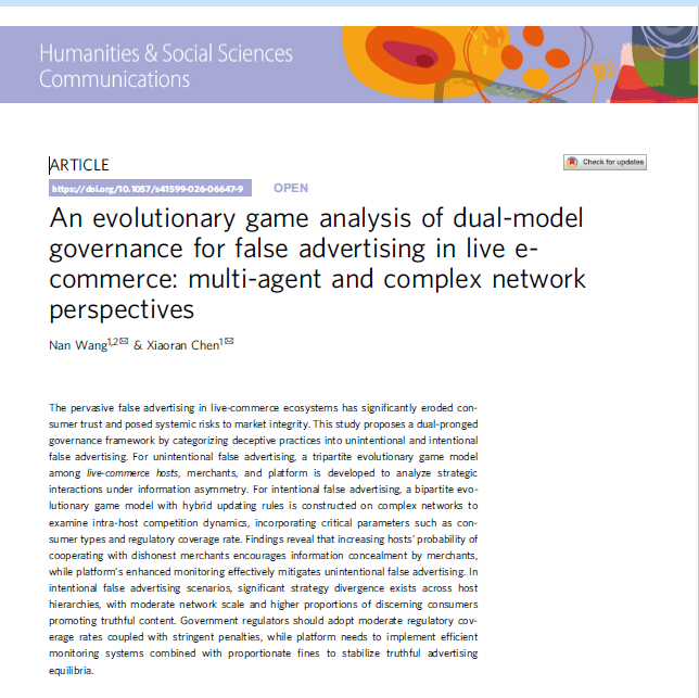 喜报!成人导航 管理科学与工程专业2023级研究生陈笑然的学术论文《An evolutionary game analysis of dual-model governance for false advertising in live e-commerce: multi-agent and complex network perspectives》于2026年3月成功发表于Nature旗下唯一的人文社会科学类子刊Humanities & Social Sciences Communications。