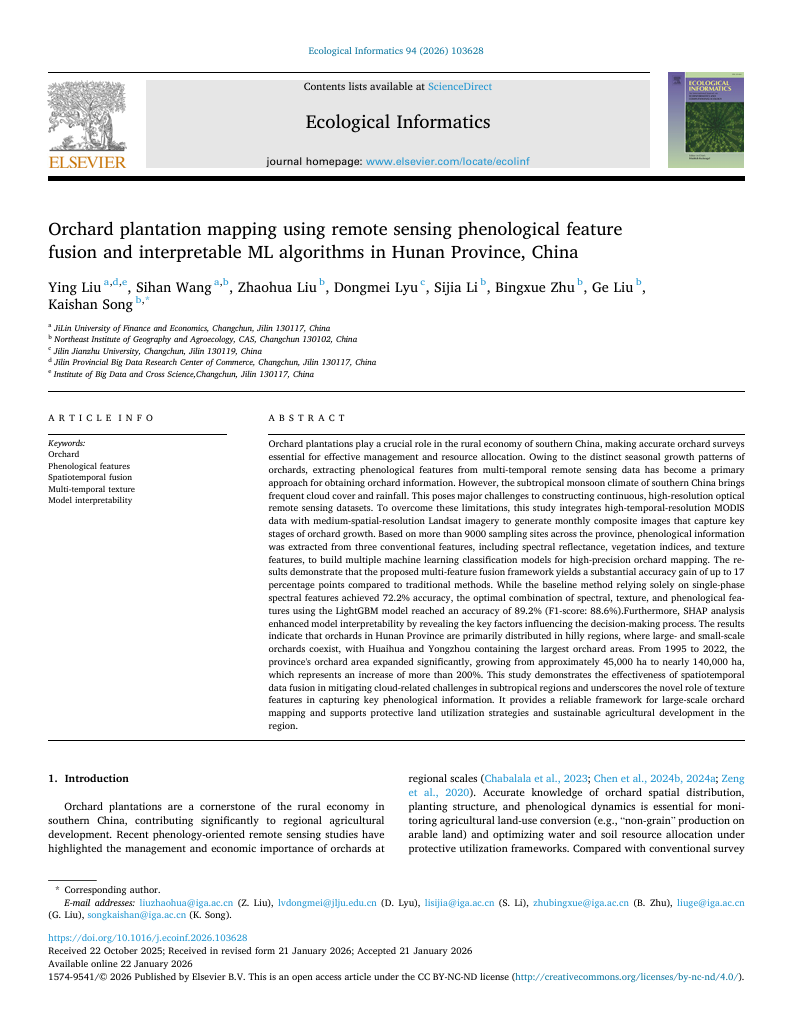 喜报!成人导航 管理科学与工程专业2023级研究生王思瀚的学术论文《Orchard plantation mapping using remote sensing phenological feature fusion and interpretable ML algorithms in Hunan Province, China》于2026年1月成功发表于中国科学院环境科学与生态学二区期刊Ecological Informatics。