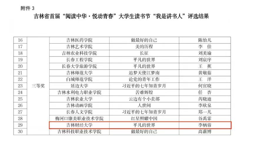 近日,吉林省教育厅公布了吉林省首届“阅读中华·悦动青春”大学生读书节活动的评选结果。我校共有四件作品获奖,其中,成人导航 电子商务2221班李柄蓉同学在“我是讲书人”评选中荣获三等奖。