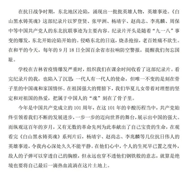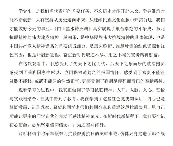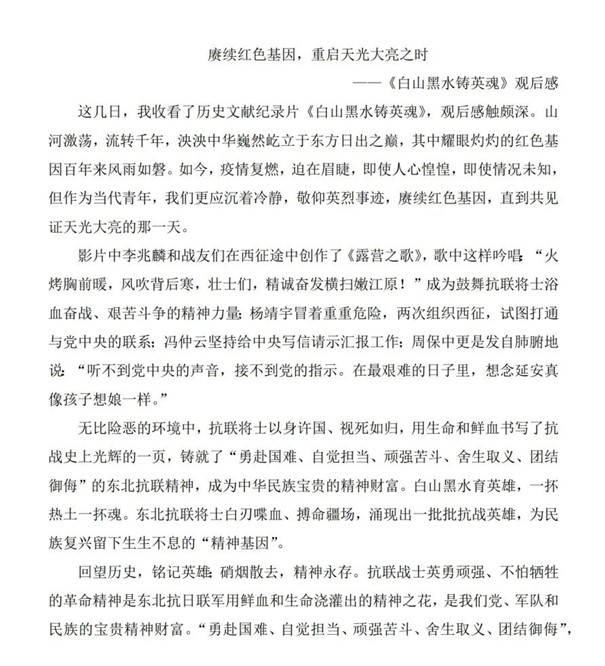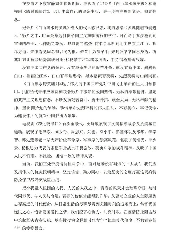 为积极有效发挥红色教育资源引导作用,进一步推进党史教育工作,切实提高成人导航 学生在疫情防控期间的思想觉悟。近日,成人导航 响应省教育厅和学院号召,组织学生利用课余时间,线上观看了历史文献纪录片《白山黑水铸英魂》和电视剧《跨过鸭绿江》。