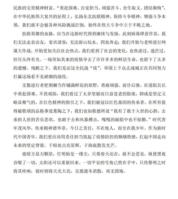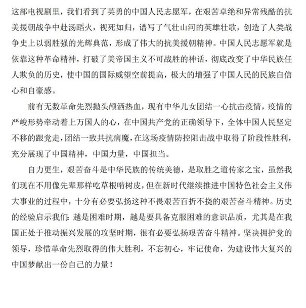 通过此次对纪录片的观看,同学们真切感受到了革命先烈在生与死、血与肉的磨砺中展现出的坚定的信仰信念、高尚的爱国情操和英勇的牺牲精神。我们当代青年应该深刻学习革命先辈对党忠诚、不负人民、无私奉献的黄金精神,更应时刻牢记“一个有希望的民族不该忘记英雄,一个伟大的民族必须铭记历史”。广大管信学子要以革命先烈为榜样,秉持坚定的初心和光荣的使命,珍惜当下的和平盛世,勇担社会责任,在当下这场没有硝烟的战争中,争做抗‘疫’先锋,为打赢疫情防控的保卫战贡献青春力量。
