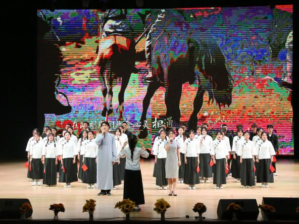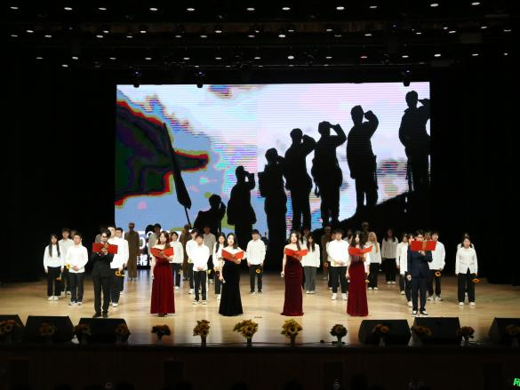 一:新民主主义革命时期。在话剧《觉醒之潮:五四风云》中,青年们高举“外争主权”与“内惩国贼”两面大旗,在民族危亡之际,探索救亡图存之道;在历史洪流之中,用青春和热血谱写了属于他们的青春之歌。随着歌曲《错位时空(五四改编版)》的悠扬旋律响起,党的百年奋斗历程和辉煌成就缓缓浮现,同学们的精彩演绎不仅再现了新时代青年的爱国情怀和奋斗姿态,更唱响了中华民族伟大复兴的激昂乐章,为我们展现了一幅闪耀着璀璨光芒的绚丽画卷。