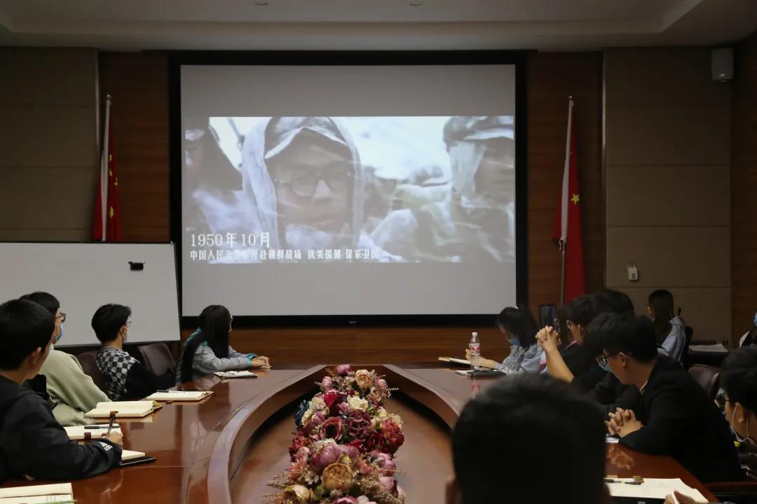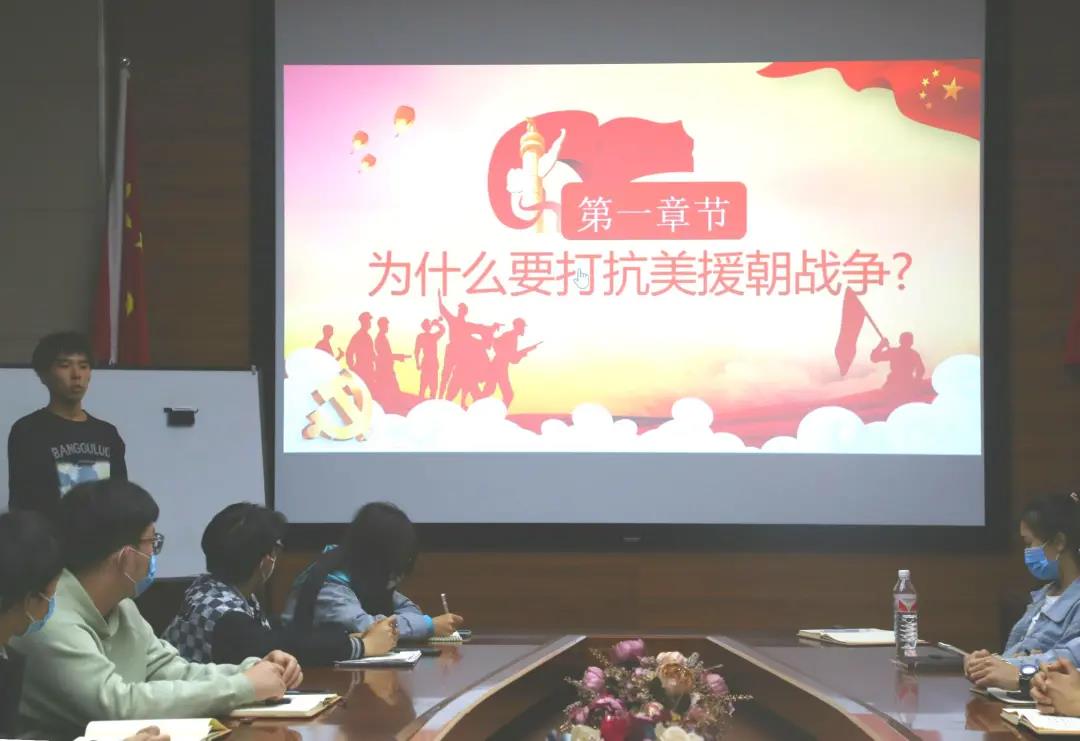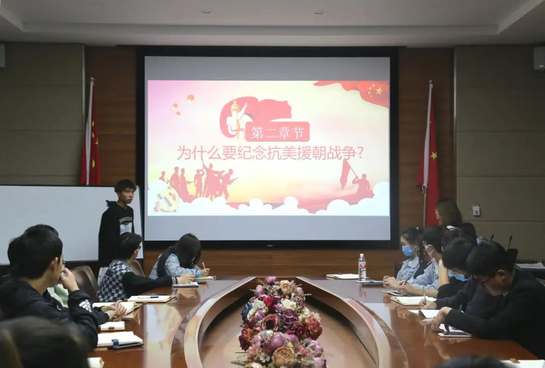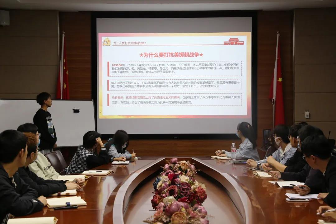 此次会议以“学习抗美援朝精神”为主题,汇报人为成人导航 数据科技2005班的同学。出席本次会议的有团委裴弼赢老师、团委副书记丁方一学长、黄伯腾学长、刘庆鹏学长以及大二各班班长、团支书、组织委员和宣传委员。