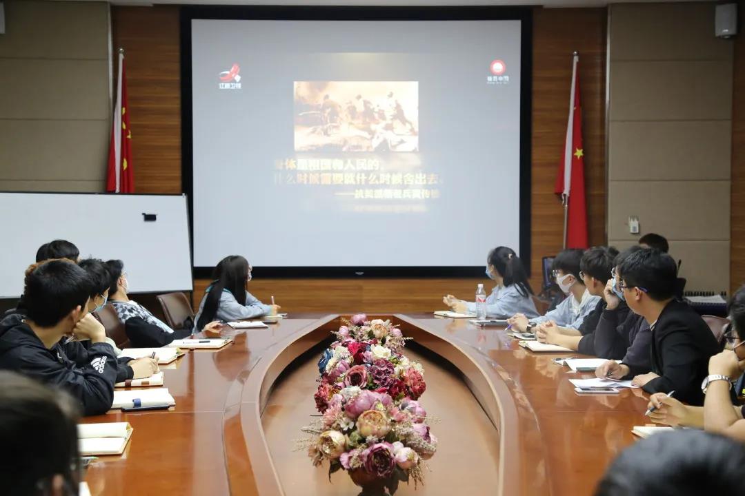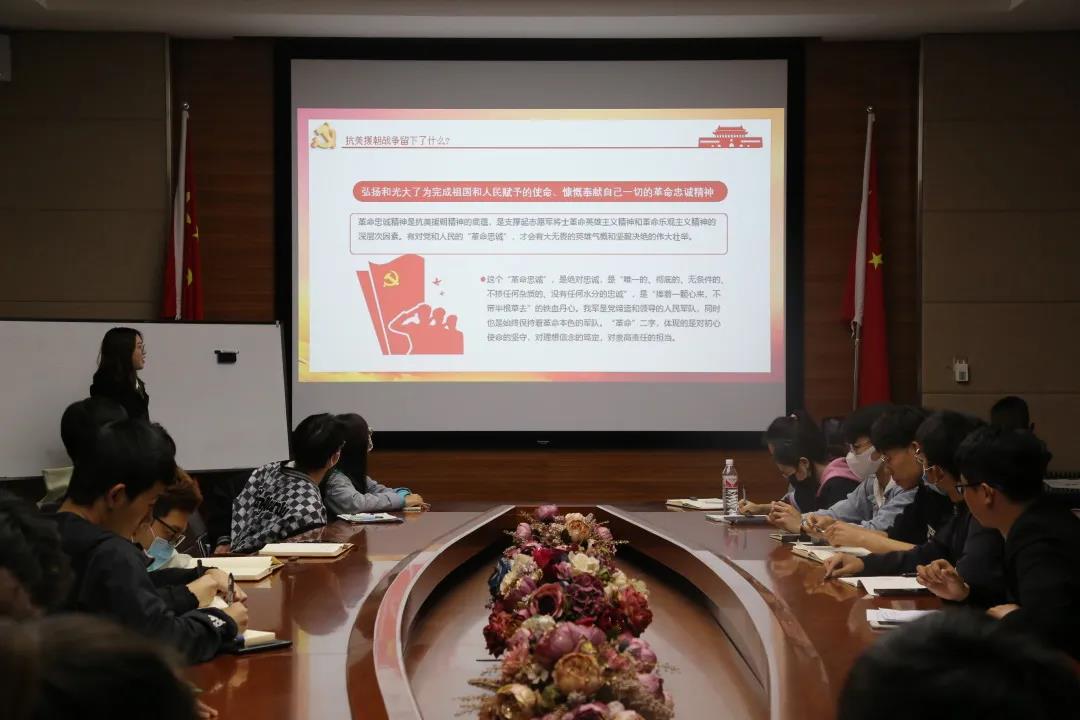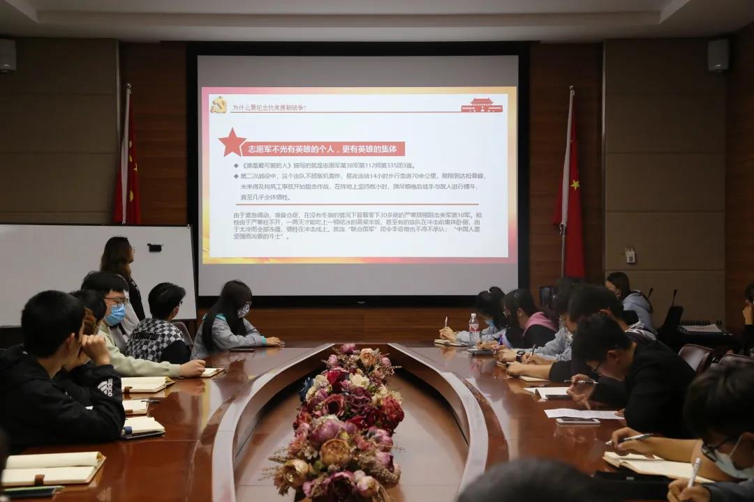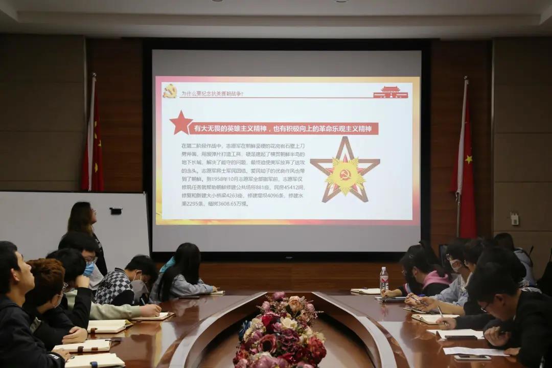 此次会议以“学习抗美援朝精神”为主题,汇报人为成人导航 数据科技2005班的同学。出席本次会议的有团委裴弼赢老师、团委副书记丁方一学长、黄伯腾学长、刘庆鹏学长以及大二各班班长、团支书、组织委员和宣传委员。