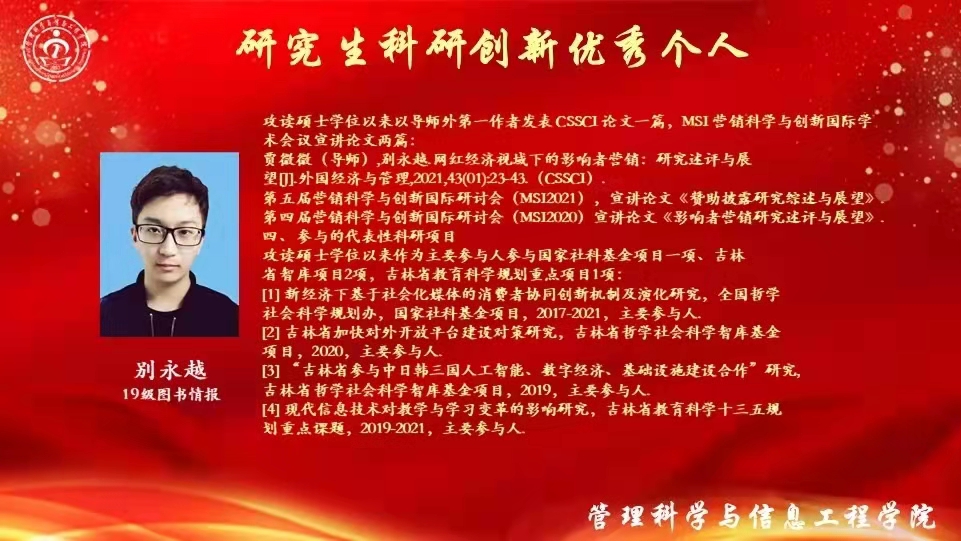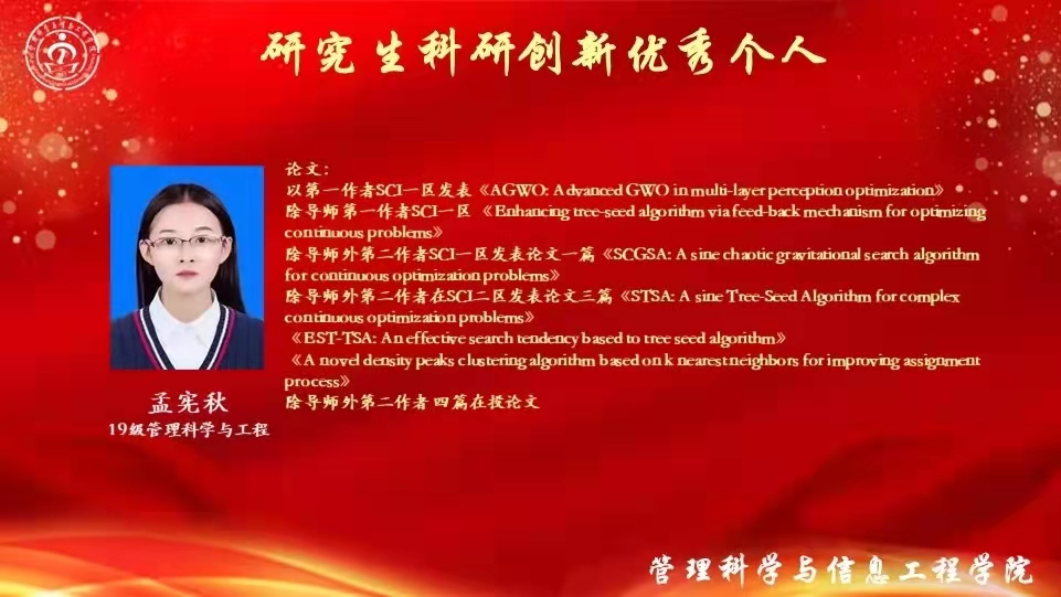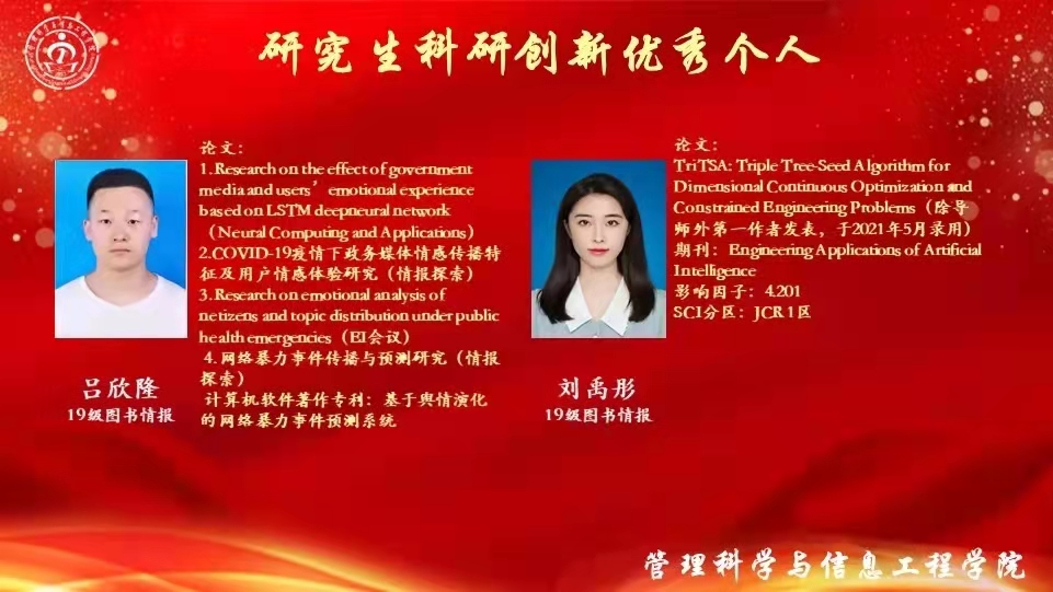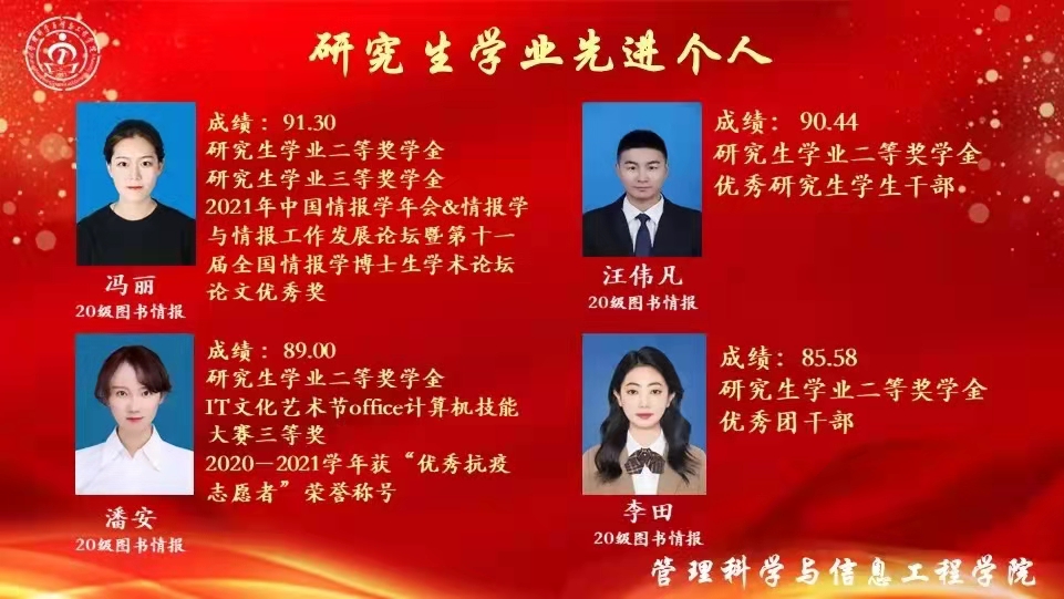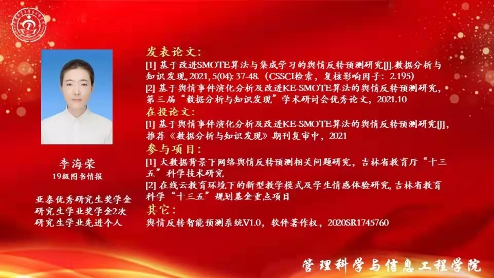 学业先进个人、科研创新优秀个人代表,2019级图书情报研究生李海荣同学分享了她的学习经验。她表示,学习与科研是研究生生活的主旋律,一分耕耘一分收获,前进的路上没有捷径。学习路途虽有坎坷,但第一篇论文被录用时,所有的努力都意义非凡,如今取得的成绩更离不开导师的悉心帮助与指导。同时,她鼓励学弟学妹们学会独立思考,把握分秒,创造属于自己的未来。