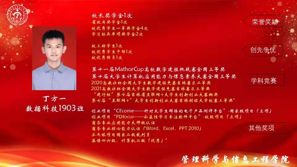 学习标兵及学科竞赛优秀个人代表,数据科技1903班丁方一同学向大家分享了他的学习心得。他表示,学科成绩名列前茅得益于认真严谨的学习作风,和及时回顾课堂内容的学习习惯。他意识到努力与收获并存,只有勤奋耕耘,才能硕果累累。对于竞赛他提出,不能抱有胆怯的心理,每次经验的积累都是在为下次的成功铺路。