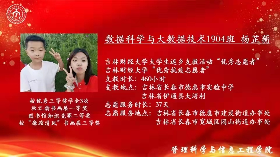 优秀志愿者代表数据科技1904班杨芷蘅同学向大家讲述了她的支教经历。当回忆起在大湾村的时光,她认为这是人生中最特别的一笔,通过支教找到了理论与实践的最佳结合点。在短短七天内,她共教授10首古诗,26个英文字母,48个音标,开展两次爱党活动,从最开始的陌生到后来的熟悉,她与孩子们的感情逐渐深厚。同时她也表示,今后会加倍努力做好学院的各项工作,坚持服务他人,奉献社会。