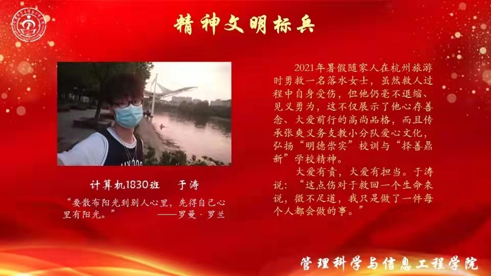 自强不息,积极进取,奋不顾身,不屈不挠。他们站在正义的道路上感化周围的人。党委书记曹景新老师宣读了学院关于对2020-2021学年自强之星及精神文明标兵表彰决定。