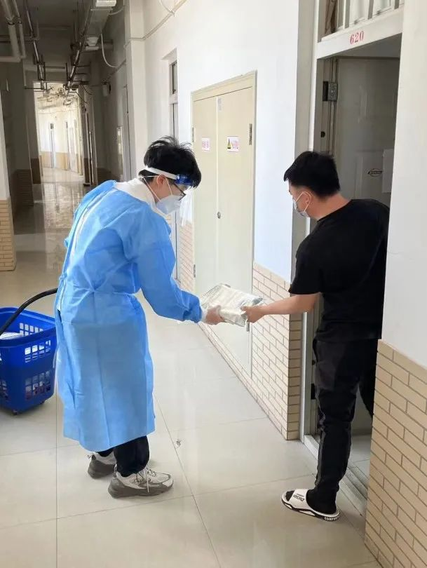 学校的防疫工作井然有序,辅导员和同学们一起住在学生宿舍,随时为同学们排忧解难,保证学生各项工作正常进行,几天一次的核酸检测分楼层进行,采样过程快捷高效。每天需要向各个寝室分发抗原检测试剂盒,让同学们在寝室内自行进行抗原自测,极大程度地避免了聚集的情况。饮食方面,每天的餐食都包裹着保温袋,保证饭菜是热腾腾地送到同学手中。