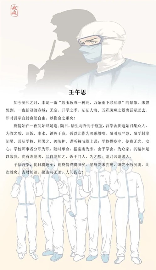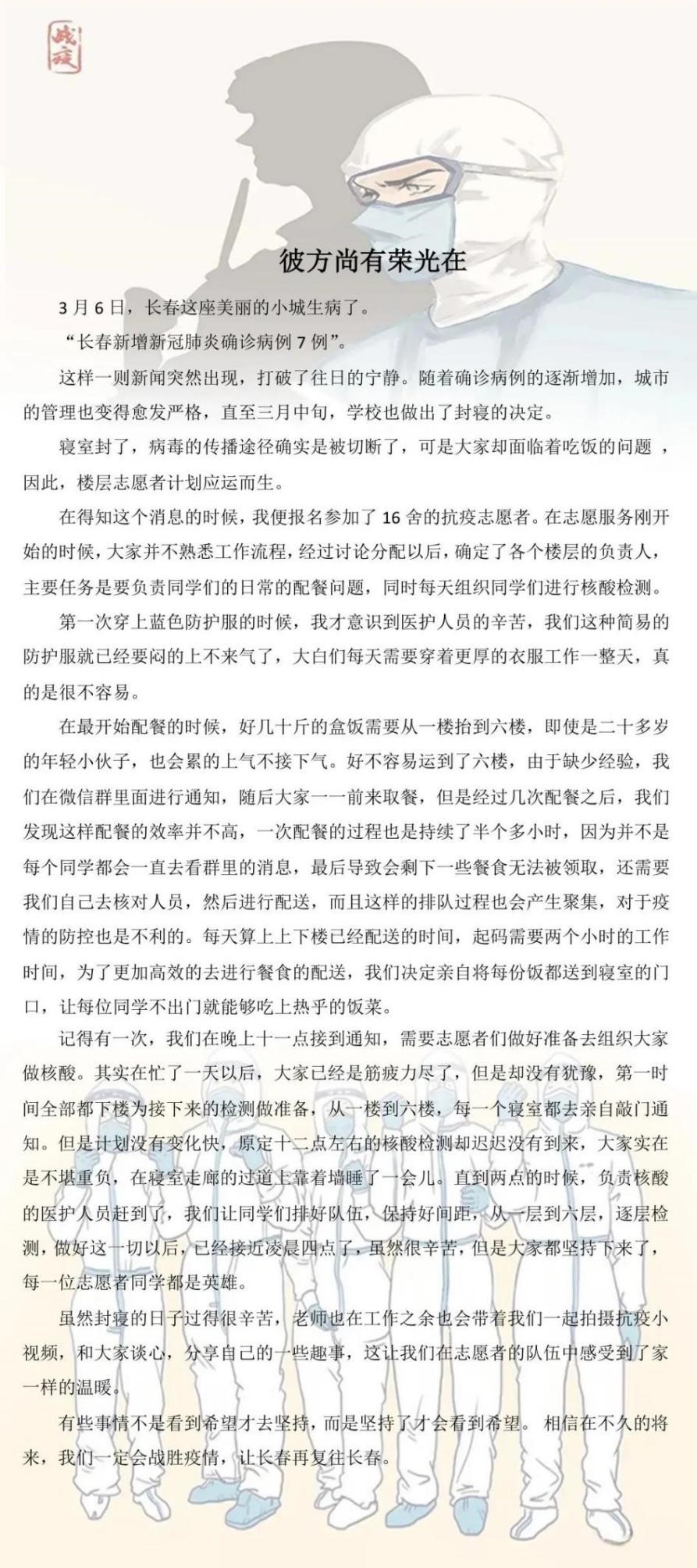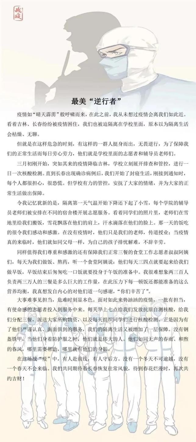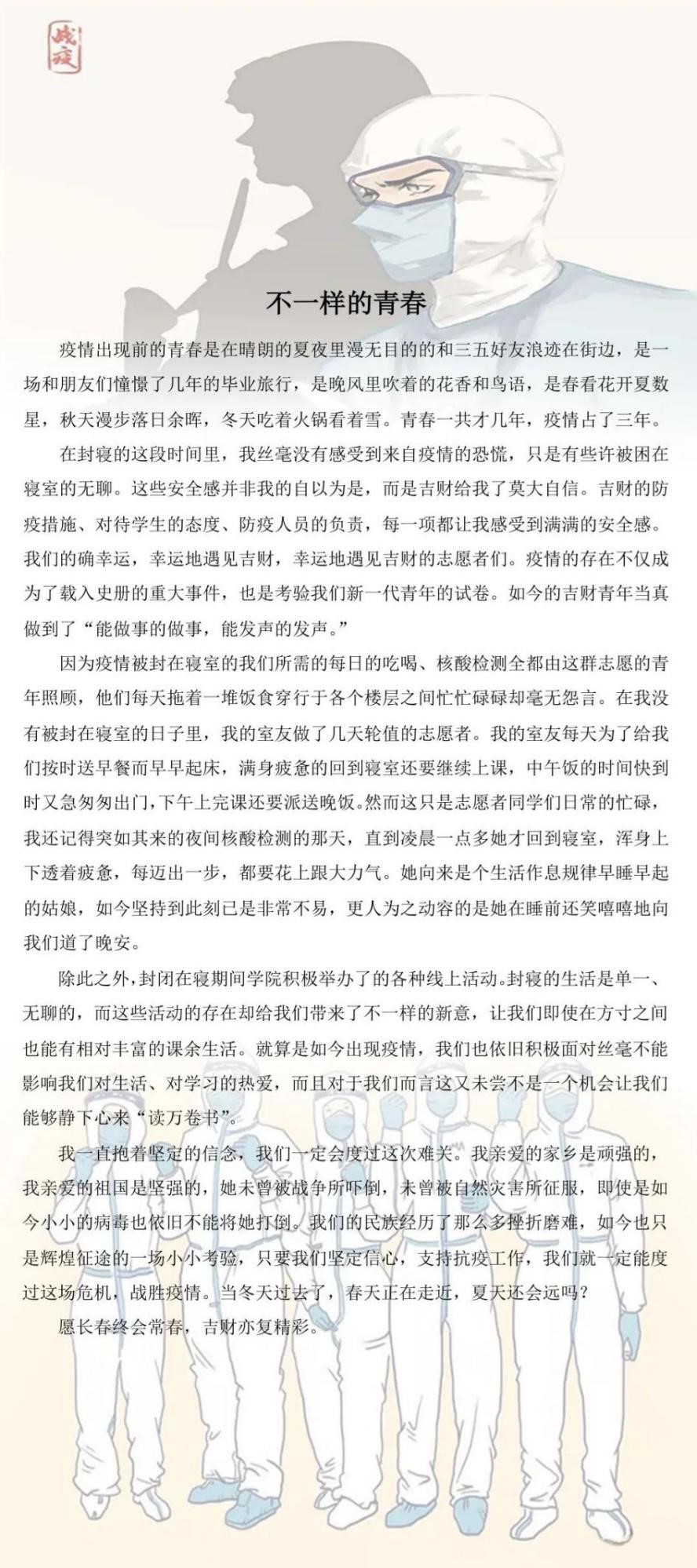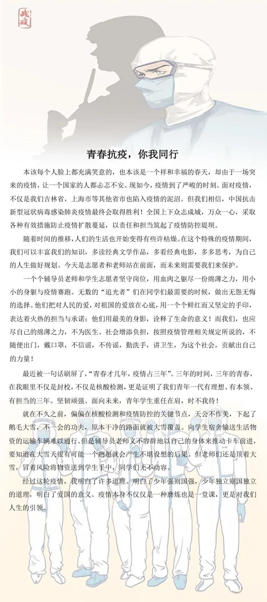 2022年春,一场突如其来的疫情席卷了本该春意盎然的北国春城,学校紧急启动措施,宿舍封闭式管理、线上授课,一瞬间,热闹的校园被按下了暂停键。为了丰富同学们在静态管理下的校园生活,成人导航 举行了“青春抗疫,你我同行”主题征文活动。在此次活动中同学们发自内心记录了当下疫情生活的真切感受,用文字无声地支持着广大奋战在各自岗位上的抗疫人员。在同学们的积极参与下,涌现出了许多优秀的作品,以下为此次活动的优秀作品展示。