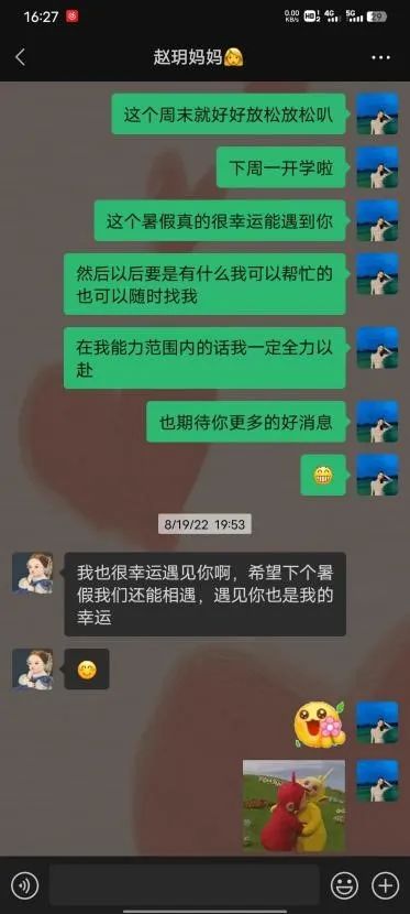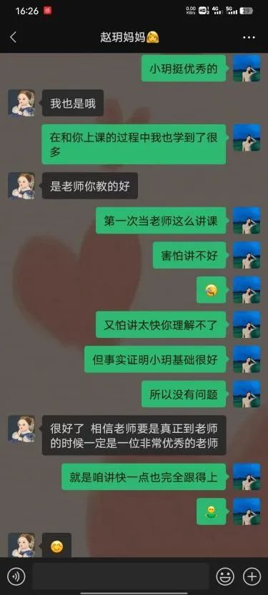 在整个上课过程中,我提出的每一个问题学生都会认真回答,也很配合我的教学。慢慢地,我对她的了解越来越多,我们也越来越熟悉。每次下课她都会礼貌地说老师再见,那一刻真的感觉好幸福。在暑假她也有加入课外培训班,最近还在准备单词比赛,每天都要求我给她讲50个单词,有很多都是超过她现在水平的,我能感受到她对知识的渴望,这也在一定程度上推动我去严格要求自己把课上好。果然老师是需要在教学过程中不断学习的,在这十几天里我的控场能力得到了很大提升,课堂上有突发情况也能灵活处理,语言表达能力更是上了一个台阶。我和她一起成长,一起成为更好的人,这大概就是教学相长吧。