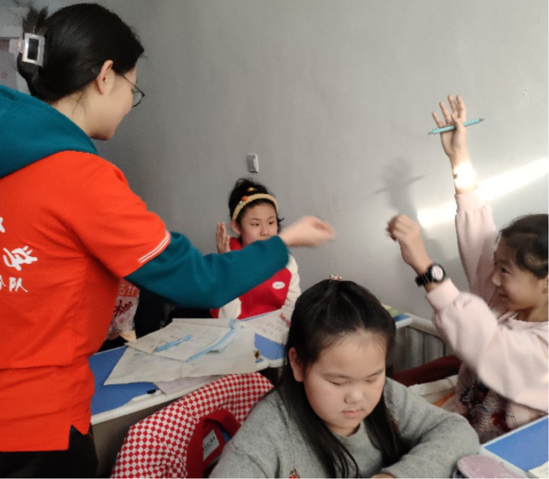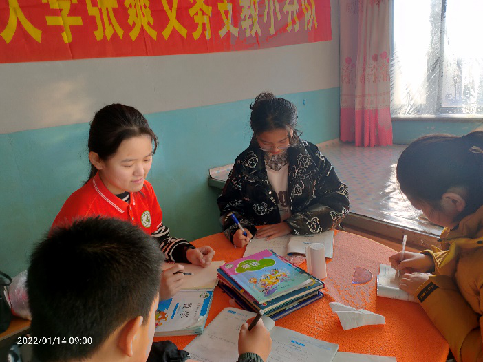 初次见到孩子们是在到村子后的第二天,我原以为也许孩子们数量不会特别多。收拾完毕后,就在等孩子们到来,上午9点左右就有14个孩子已经到了。我先和孩子们聊天,告诉他们我们来自哪里,来做什么。同时了解他们感兴趣的学科和薄弱的学科以及年级等信息。有一个孩子令我印象深刻,聊天时,他一言不发,坐在靠后的位置。我们经过了解才知道,十多个孩子中,只有他辍学了,家庭条件很特殊。我和学姐把他作为重点的教学和帮助对象,联系他的家长和村里的管理人员,鼓励他入学学习,不要放弃学业。